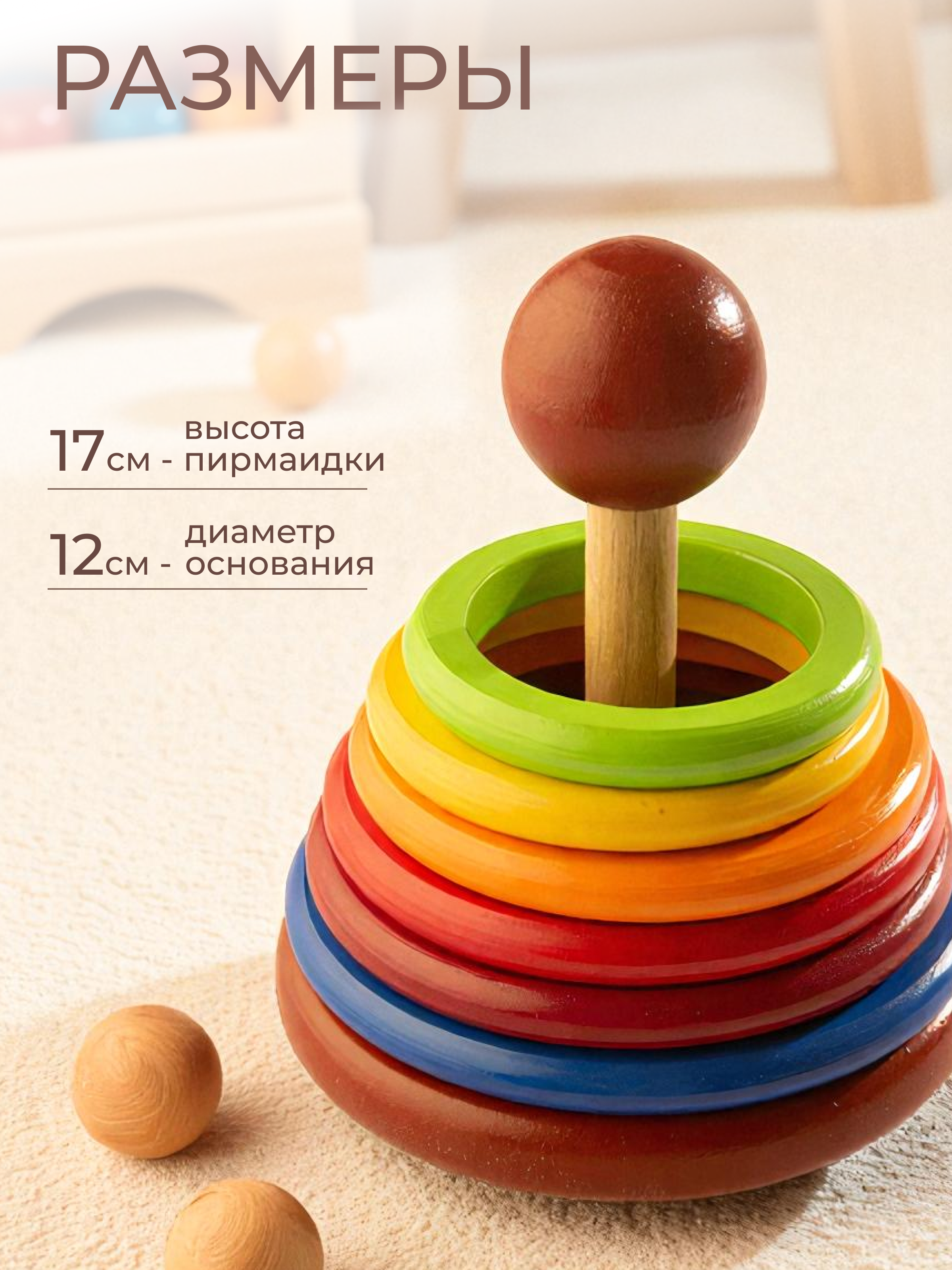 Материал: липа (кольца), МДФ (основание), бук (стержень и шар)