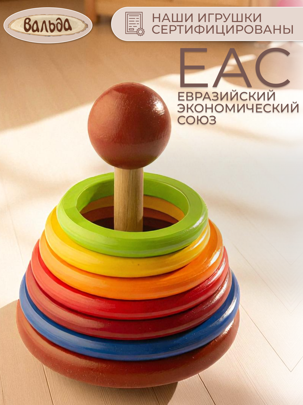 Пирамидка представляет из себя подставку со стержнем и шариком-набалдашником, на которую надеваются шесть (6) разноцветных колец разного диаметра. Колечки можно брать двумя руками или одной. Они большие, нанизывать их на основание - одно удовольствие!